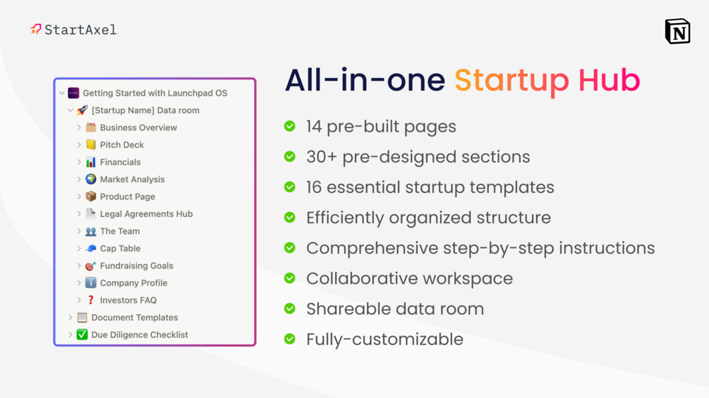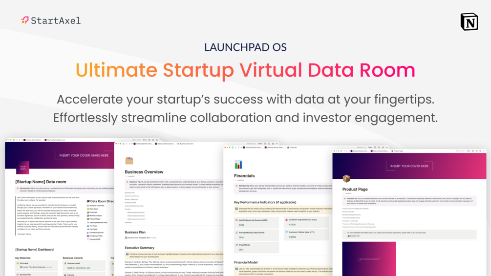 Introducing Launchpad OS – the ultimate virtual command center for startups. This all-in-one virtual startup data room for Notion serves as a comprehensive solution for streamlining the fundraising process and centralizing your startup data in one place. It offers unparalleled convenience, combining fully-customizable sections, pre-designed document templates, a document repository, a collaborative workspace, due diligence checklist, and robust privacy and security features. With mobile accessibility, you can stay connected and in control, wherever you are.