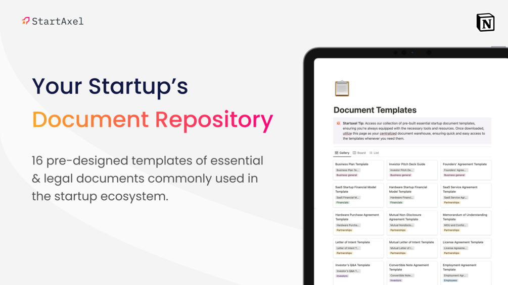 ✅ Pre-designed Document Templates: A convenient repository of pre-built templates of essential documents commonly used in the startup ecosystem such as:
